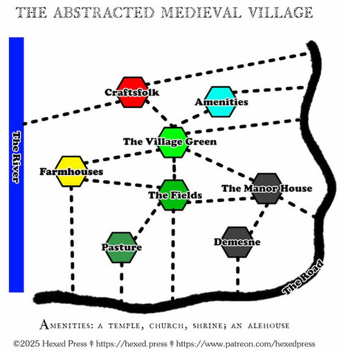 This image is a version of such an abstracted representation of a village. The dotted lines show the connections between areas and each other. A larger version of this image is up on the Patreon.